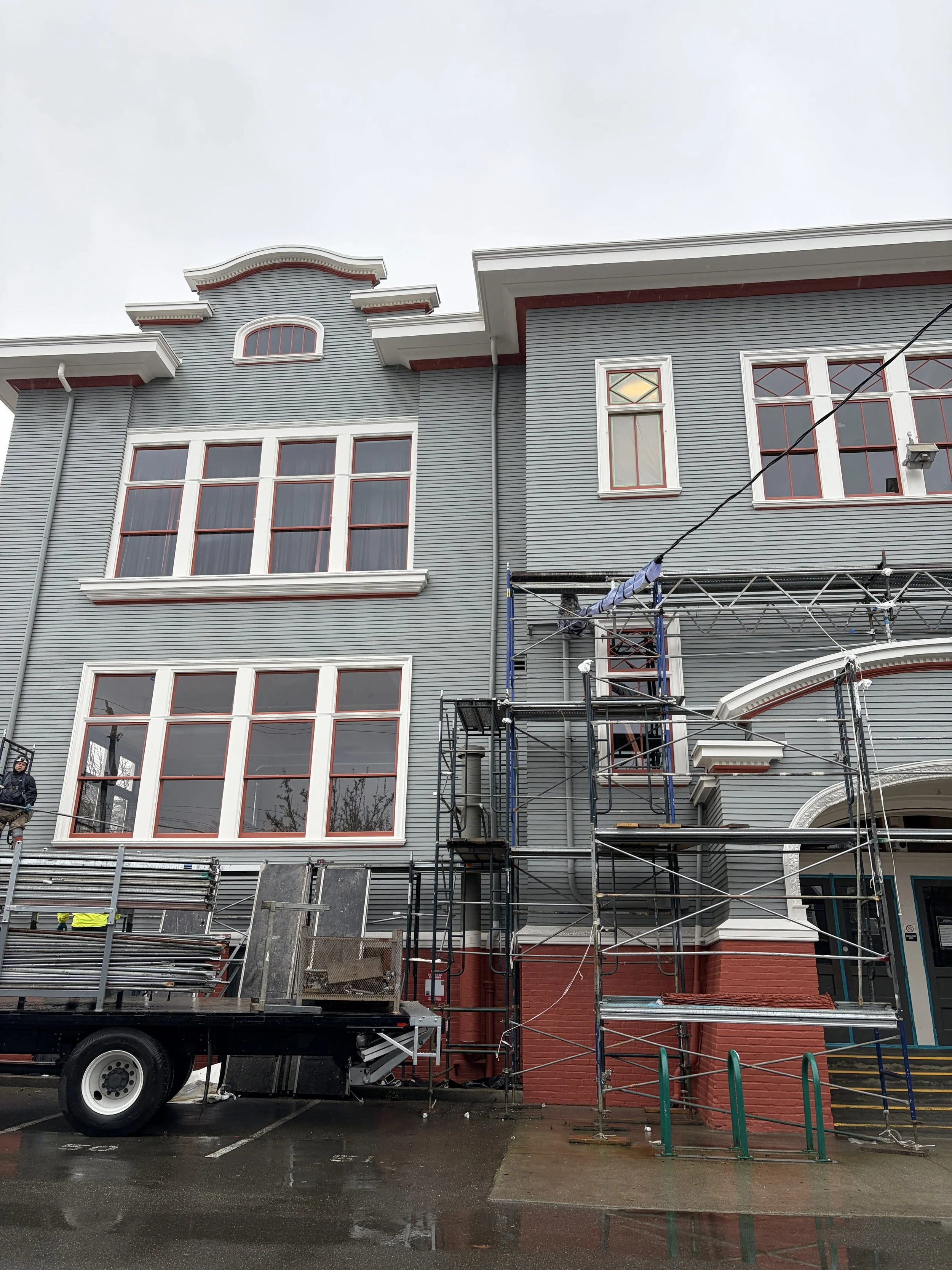Window restoration and paint application began on August 4th, 2025. The painting will be a darker green color to adhere to the historic color selection.