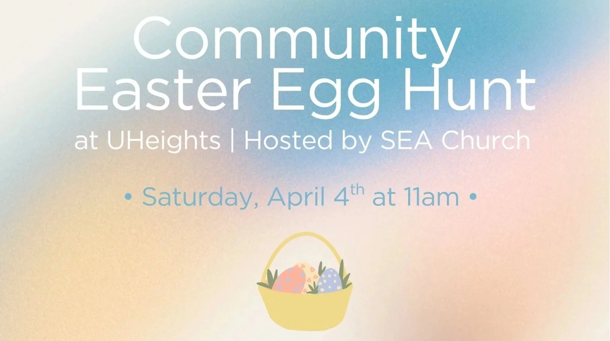 Join our resident organization, SEA Church, at 10:30 AM for free coffee and donuts at the UHeights Playground and a free community Easter Egg Hunt for all children walking to age 12 at 11 AM. Plus, bring the whole family for free photos with the Easter Bunny!